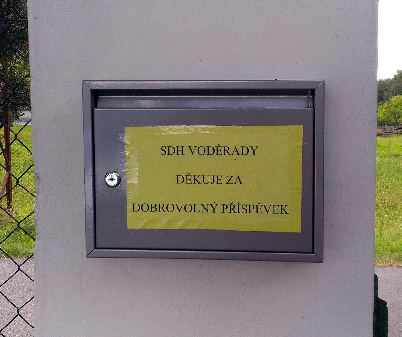 chodu z areálu. Je to schránka na dobrovolné příspěvky na údržbu vody, klouzačky, houpaček a prolézaček. Všem, kteří už přispěli, nebo tak učiní nškdy v budoucnu, DĚKUJEME.